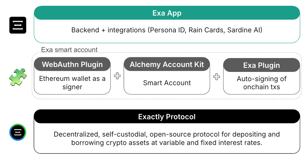 * [Exa Plugin](https://docs.exact.ly/exa-app/exa-plugin): enables users to borrow, lend, and manage credit and debit transactions through a self-custodial smart account, in other words, it ensures a smooth DeFi experience, automating key financial operations while maintaining security and efficiency.
