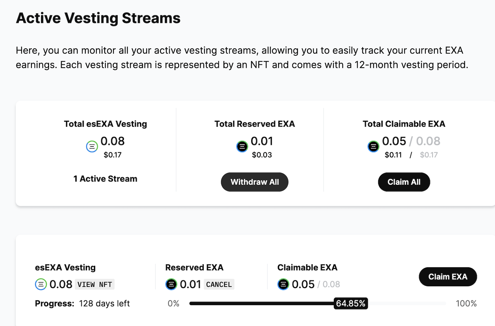 When you withdraw the reserved EXA, the associated vesting streams will be canceled automatically. You’ll get back the earned EXA and all remaining esEXA.