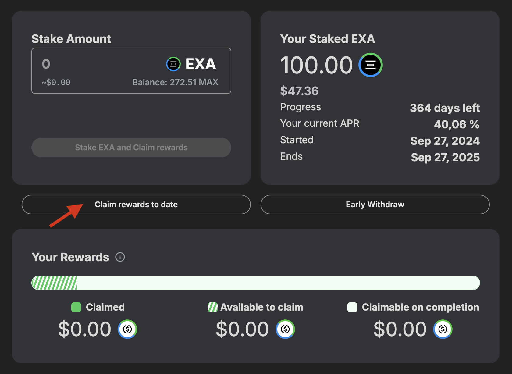 The staking period will be twelve months. During this time, the stakeholder can add more EXA to their stake to earn more rewards, claim them, or partially/fully unstake their position.