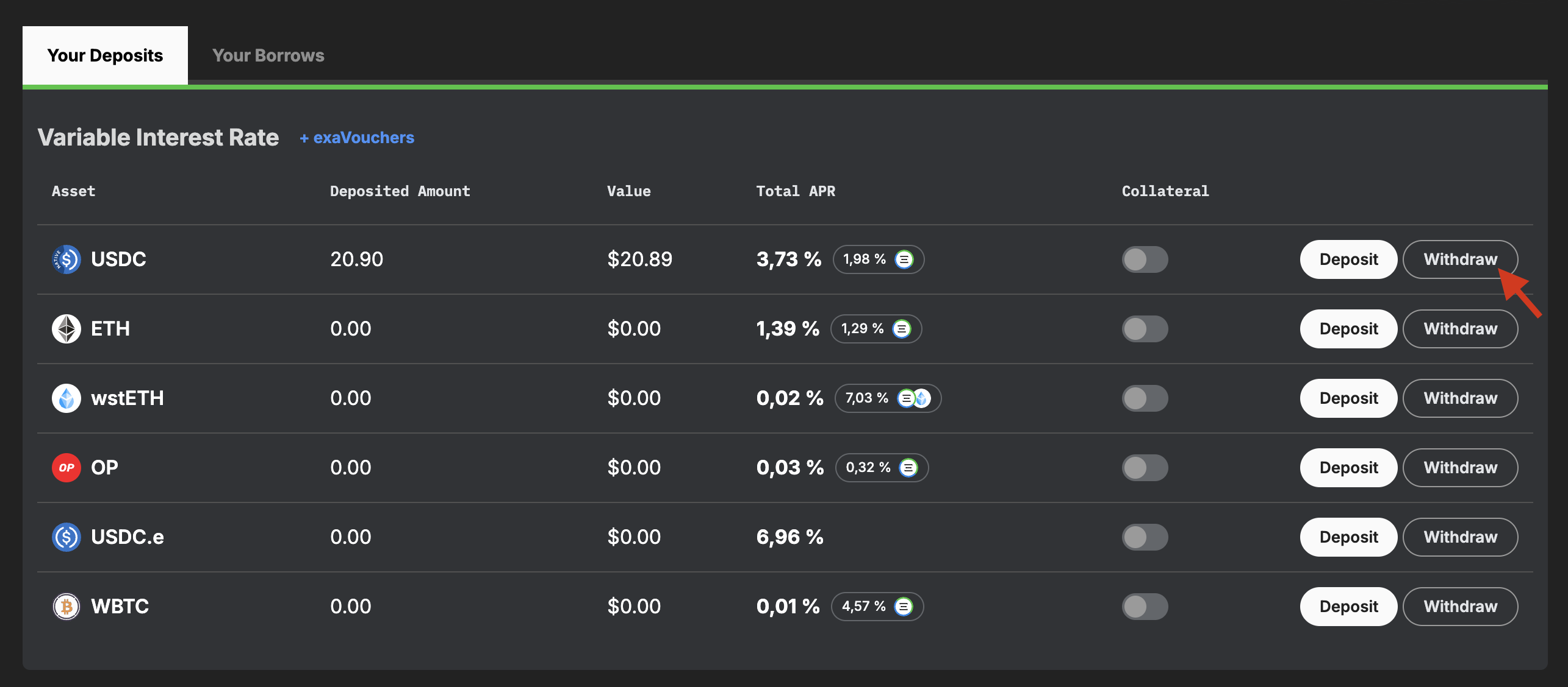 You can swap your exaUSDC for USDC by clicking “Withdraw”