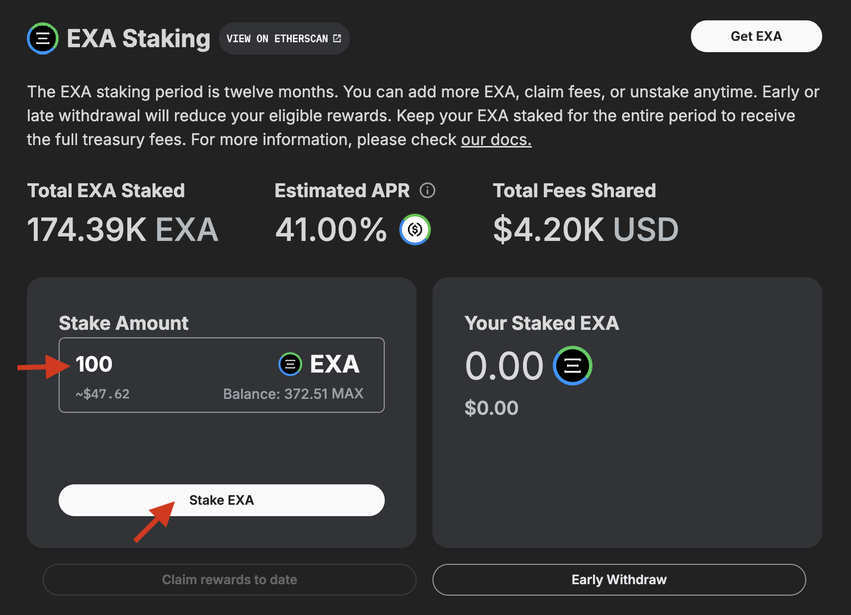 * Click “Stake EXA” to confirm.